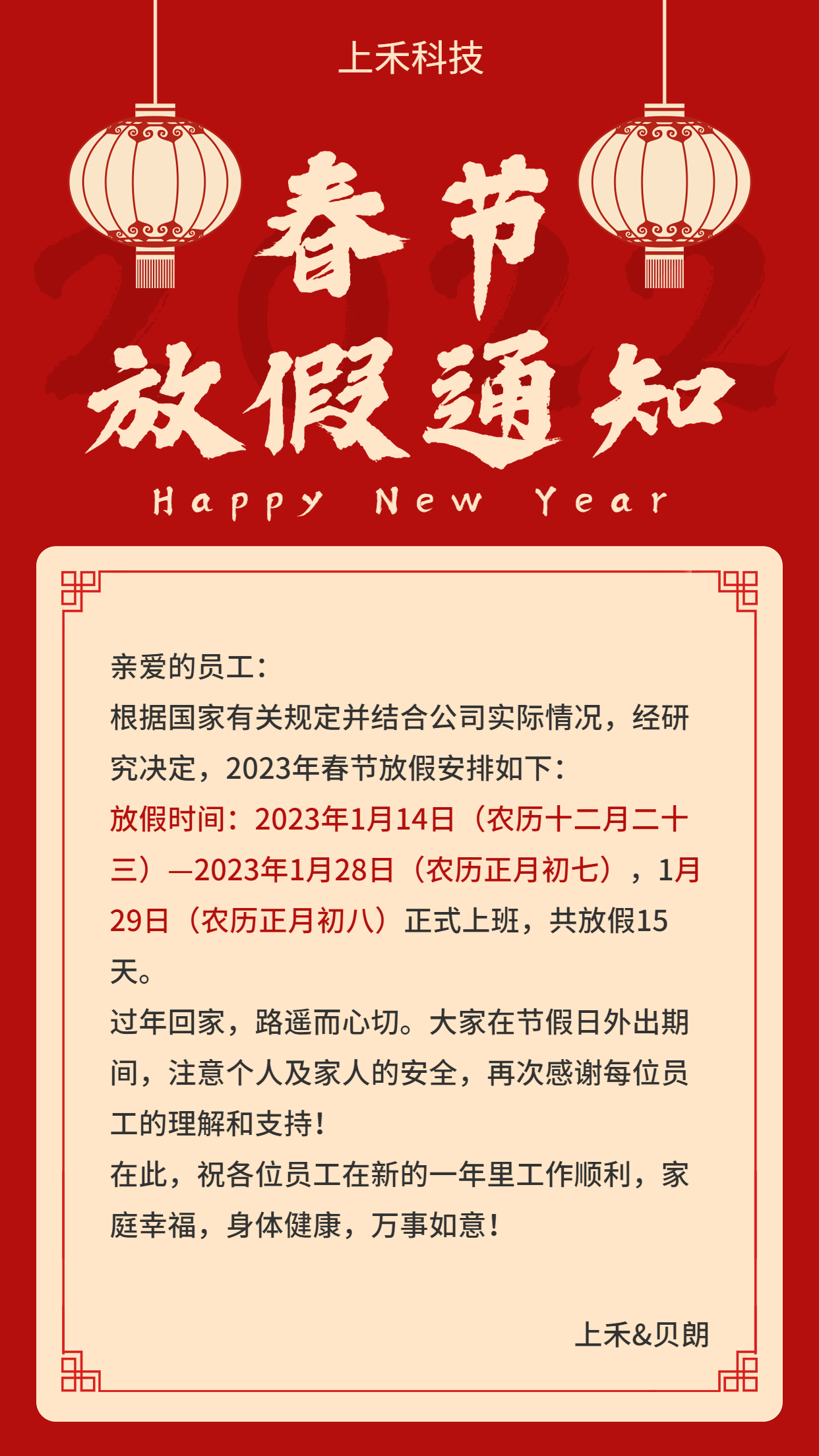 2023春節即將到來(lái),感謝您一如既往的支持與厚愛(ài),在此之際上禾向您致以節日的問(wèn)候,祝大家新年快樂(lè ),平安喜樂(lè )!