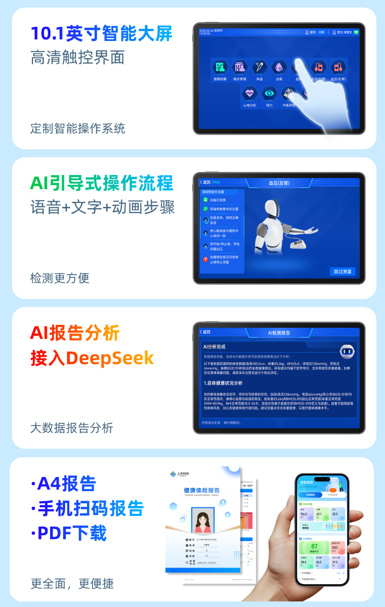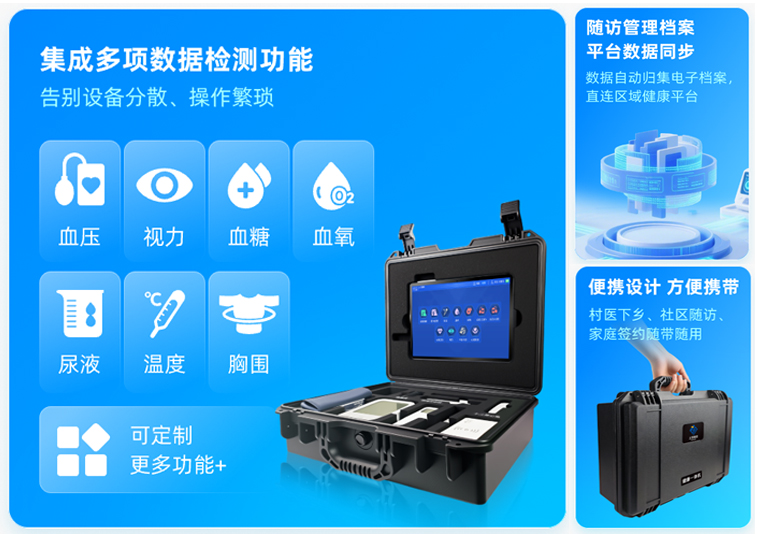 SH-203便攜式健康體檢一體機是上禾針對基層公衛推出的一款便攜式公共衛生檢測設備,可以通過(guò)平板電腦等數據采集終端和數據管理軟件系統實(shí)現一體化整合,實(shí)現血壓、心率、血氧、體溫、心電、血糖、尿酸、血紅蛋白、血脂四項、尿常規等多種參數檢測,快速建立居民電子健康檔案,與信息管理平臺或健康檔案管理系統進(jìn)行數據交互傳輸,可上傳或成批次/單獨下載調用數據,并提供接口開(kāi)發(fā)包,支持將采集到的健康數據上傳至區域信息平臺或健康檔案管理系統。支持隨訪(fǎng)管理以及AI報告分析,支持PDF報告上傳。